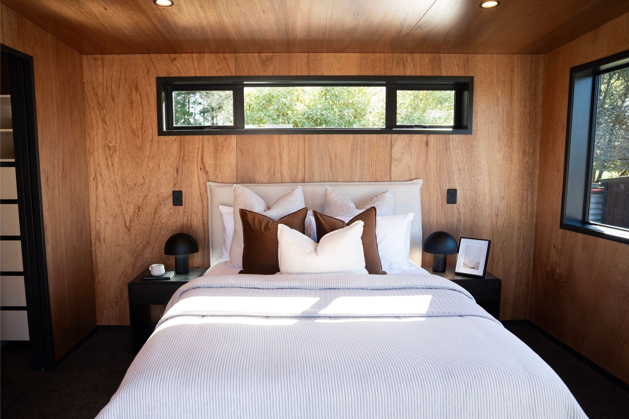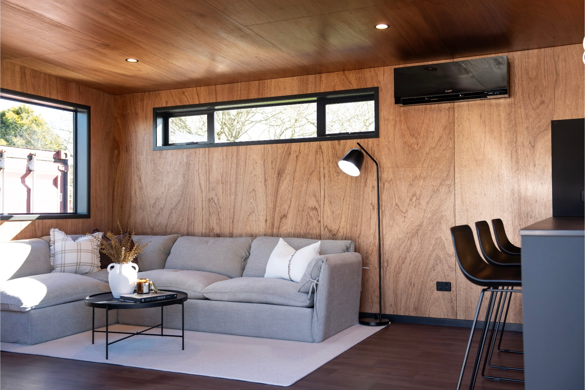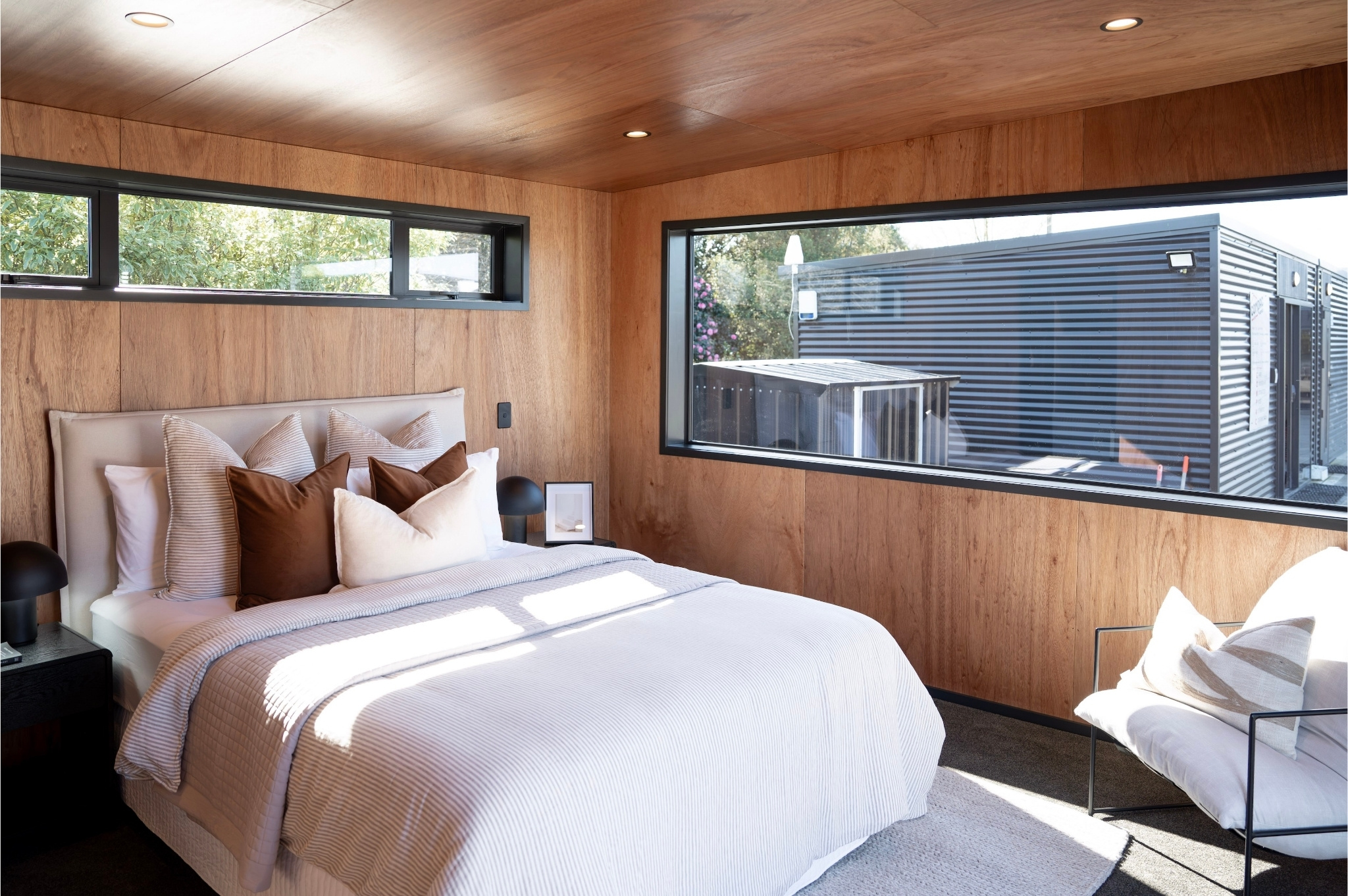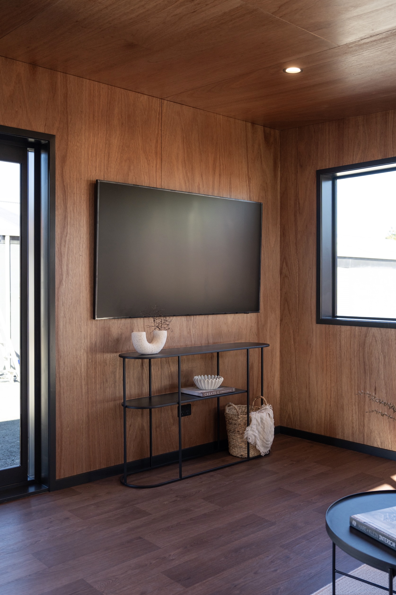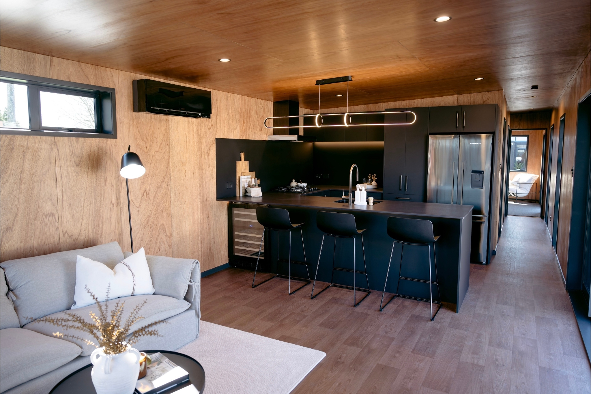 A home built to adapt. The open-plan layout allows effortless reconfiguration as life changes, while the oversized end window can be oriented to capture the best views on any site. The Euro tray cladding with concealed fixings minimises maintenance, and oiled ply wall linings, matte black cabinetry, and durable surfaces ensure it stays looking fresh for years. Energy-efficient LED lighting, premium appliances, and soft relocation-ready connections keep ongoing costs and environmental impact low.