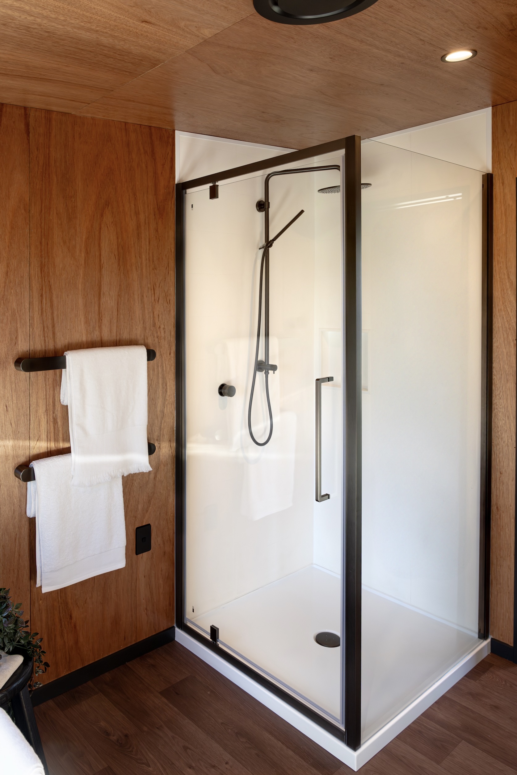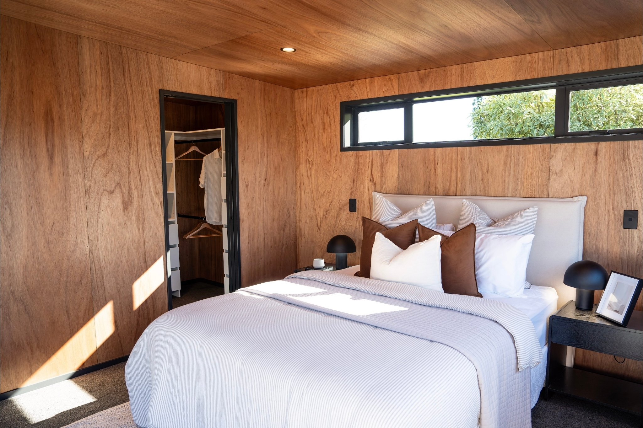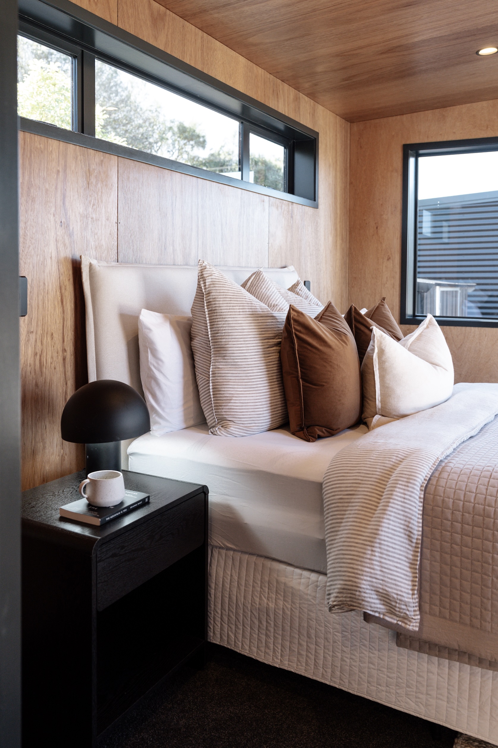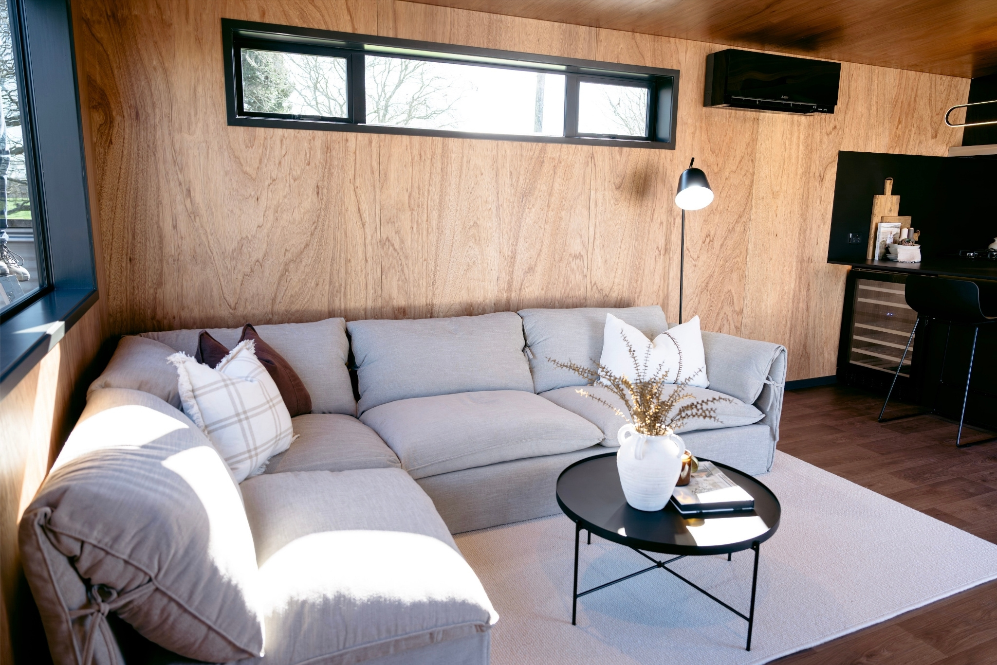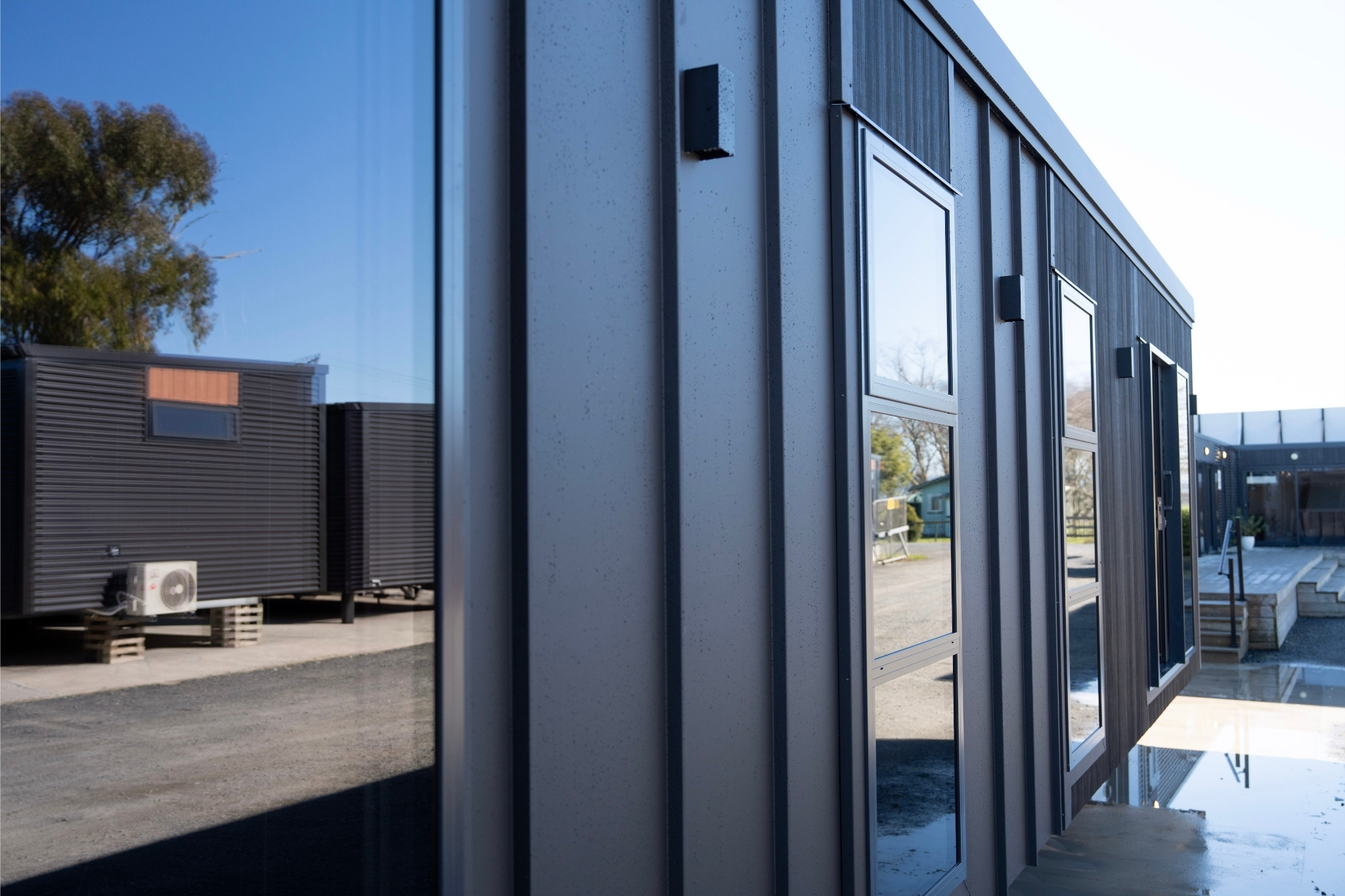 A home built to adapt. The open-plan layout allows effortless reconfiguration as life changes, while the oversized end window can be oriented to capture the best views on any site. The Euro tray cladding with concealed fixings minimises maintenance, and oiled ply wall linings, matte black cabinetry, and durable surfaces ensure it stays looking fresh for years. Energy-efficient LED lighting, premium appliances, and soft relocation-ready connections keep ongoing costs and environmental impact low.