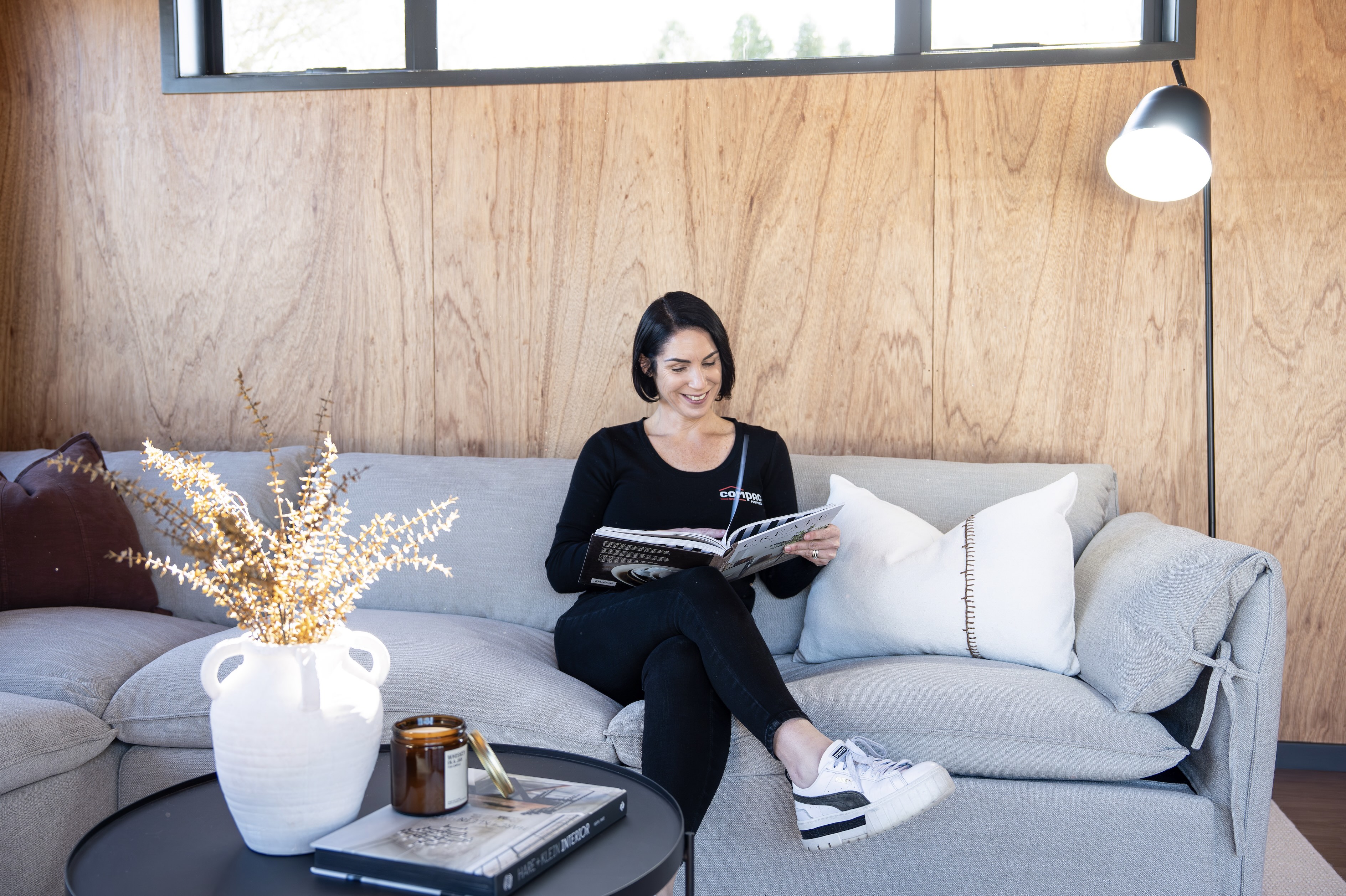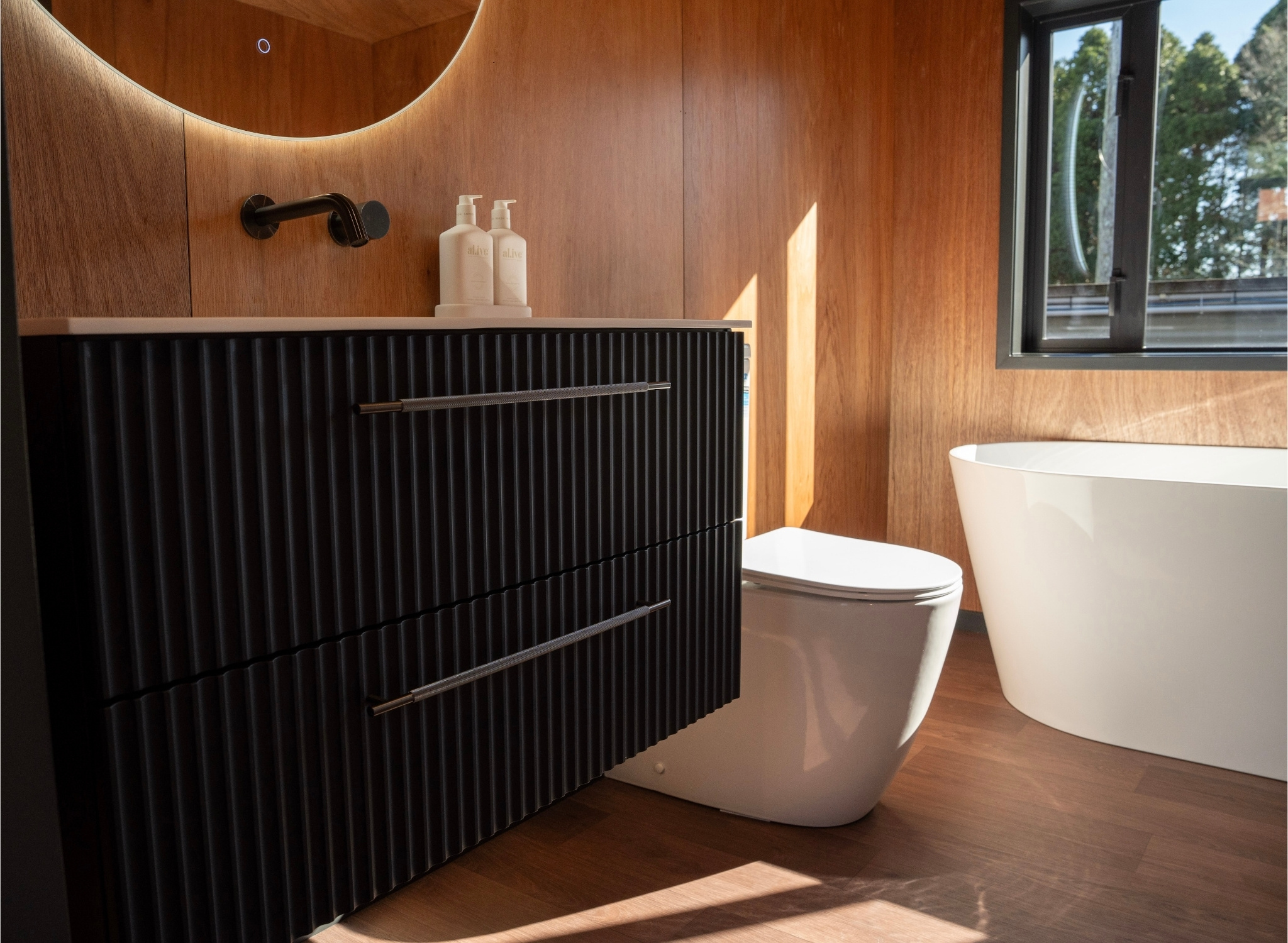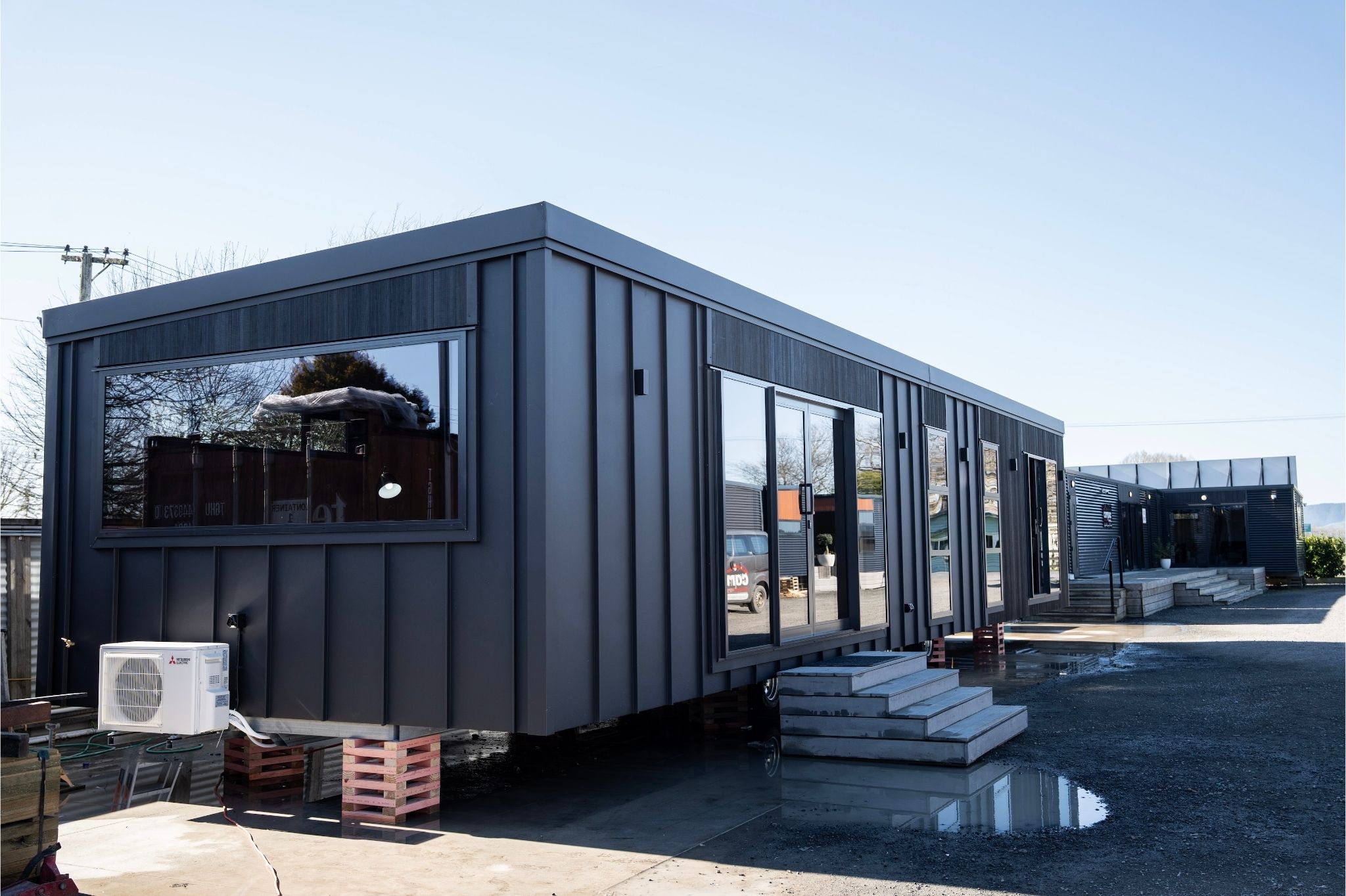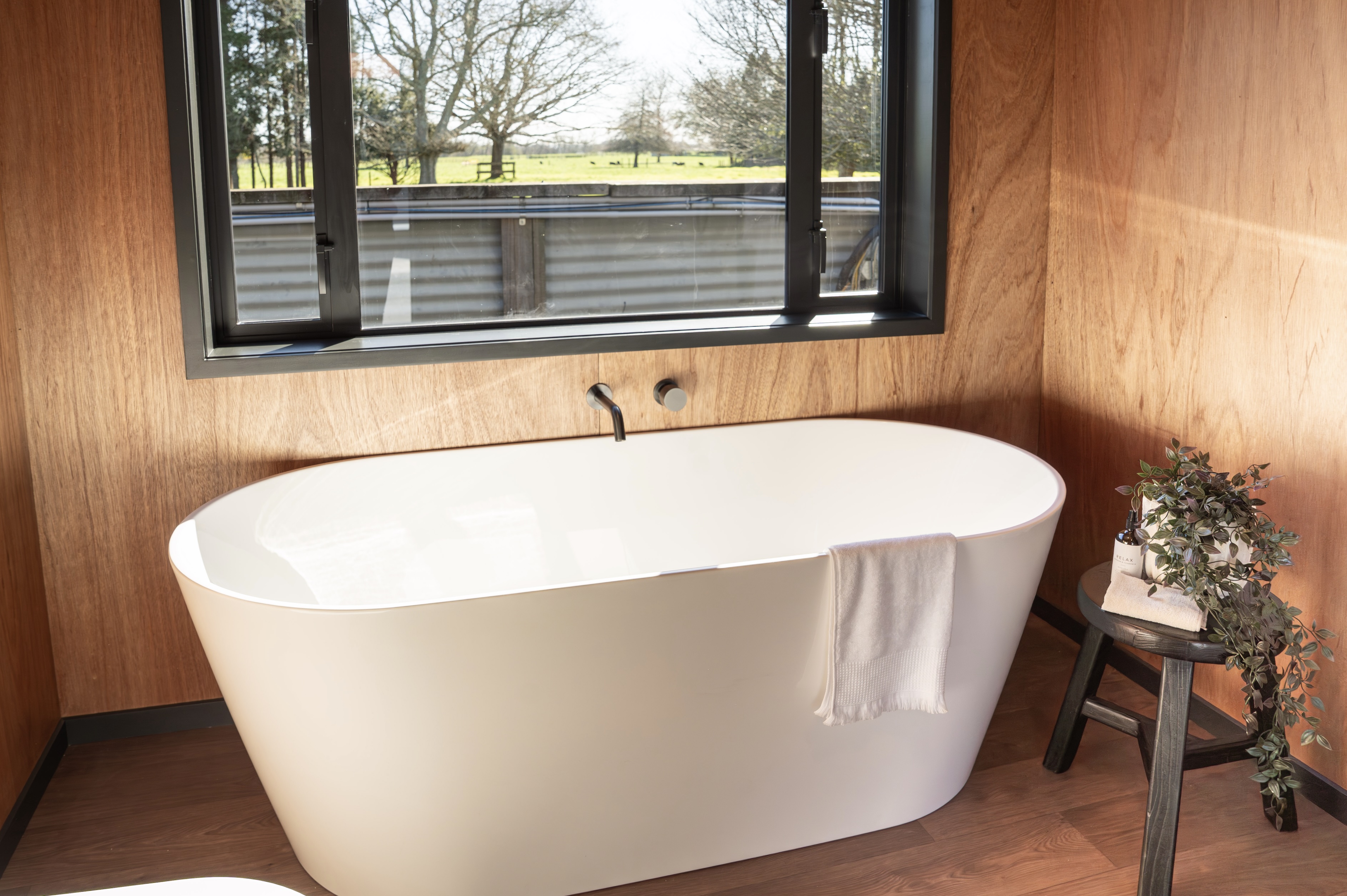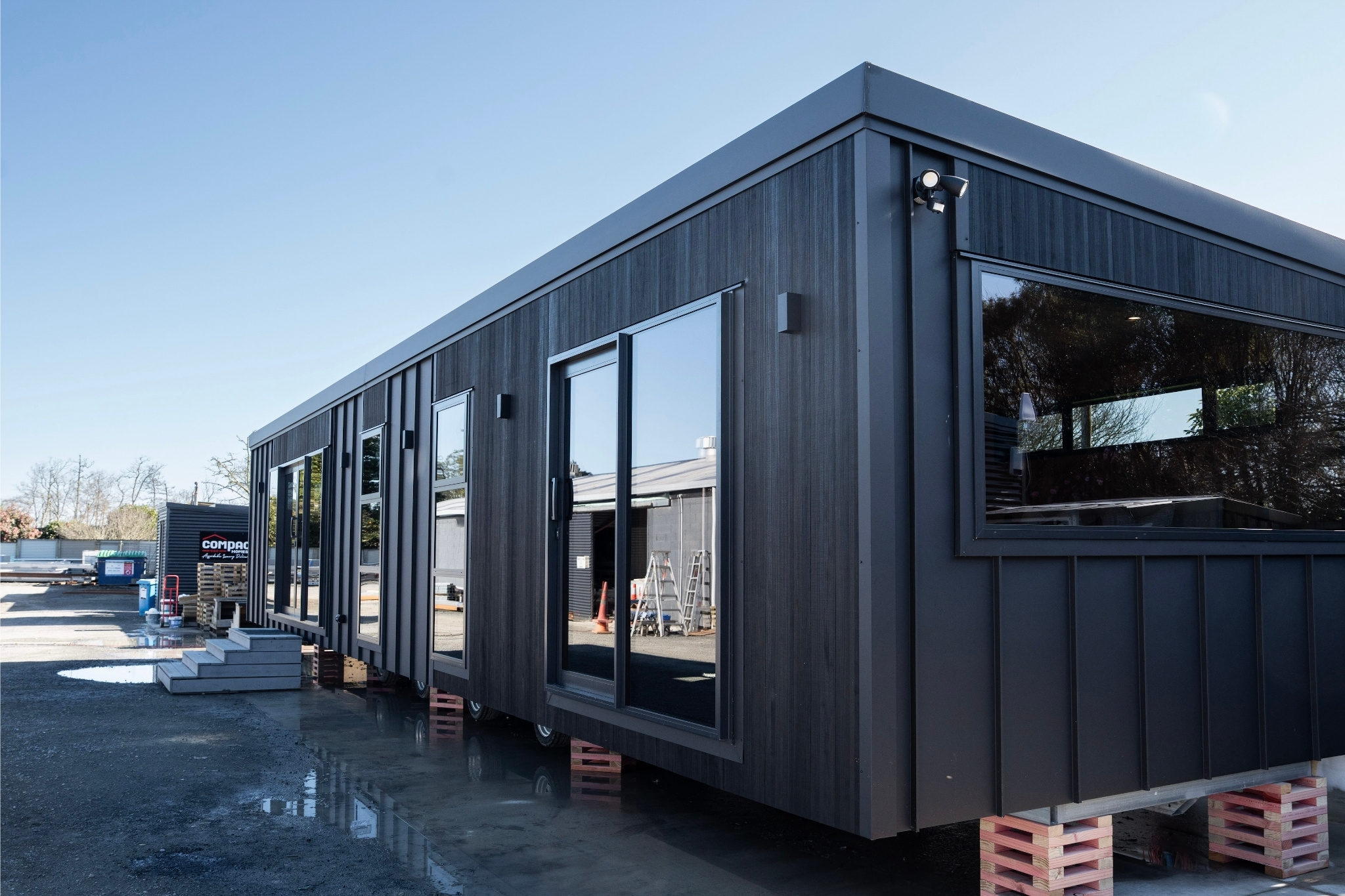 A home built to adapt. The open-plan layout allows effortless reconfiguration as life changes, while the oversized end window can be oriented to capture the best views on any site. The Euro tray cladding with concealed fixings minimises maintenance, and oiled ply wall linings, matte black cabinetry, and durable surfaces ensure it stays looking fresh for years. Energy-efficient LED lighting, premium appliances, and soft relocation-ready connections keep ongoing costs and environmental impact low.