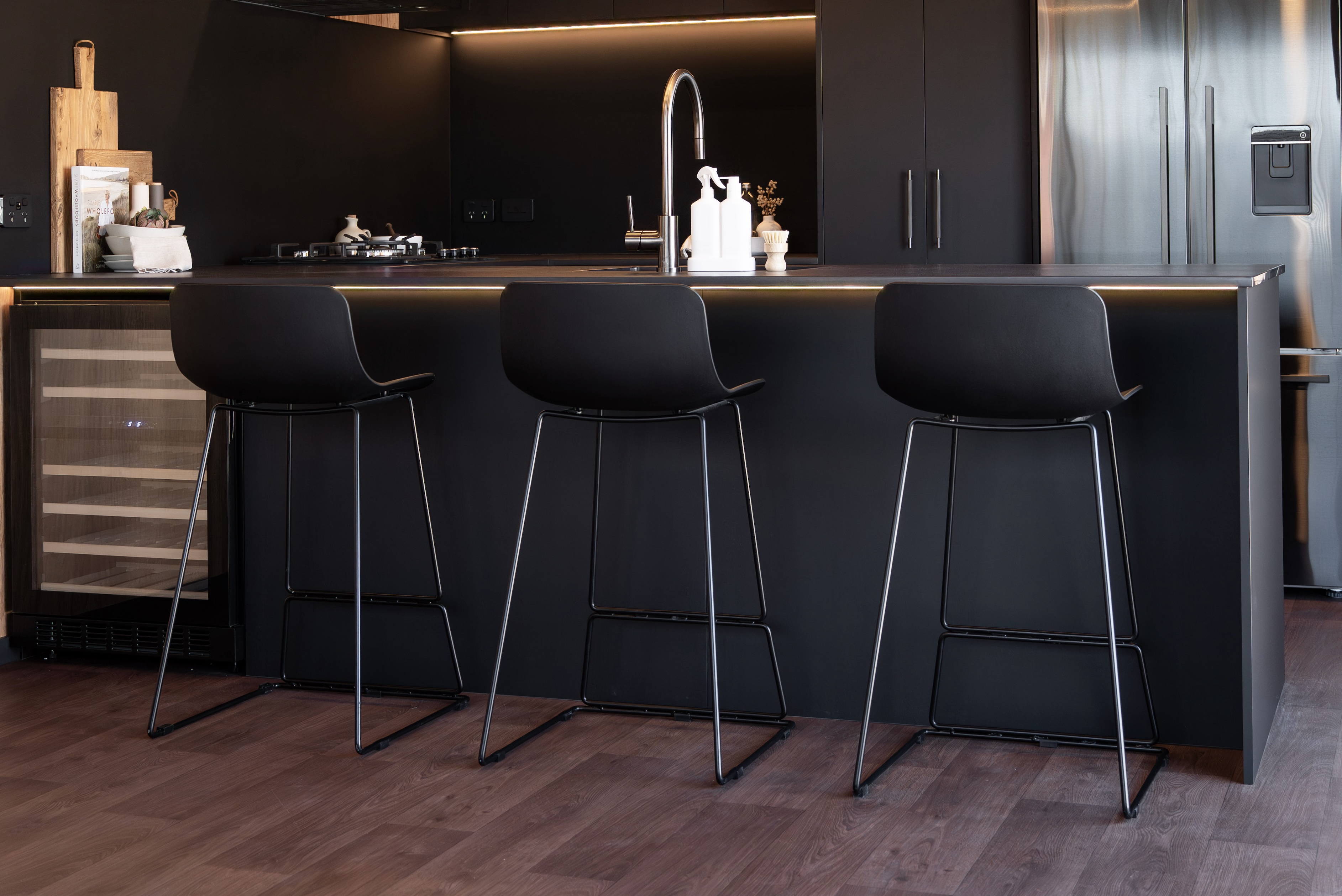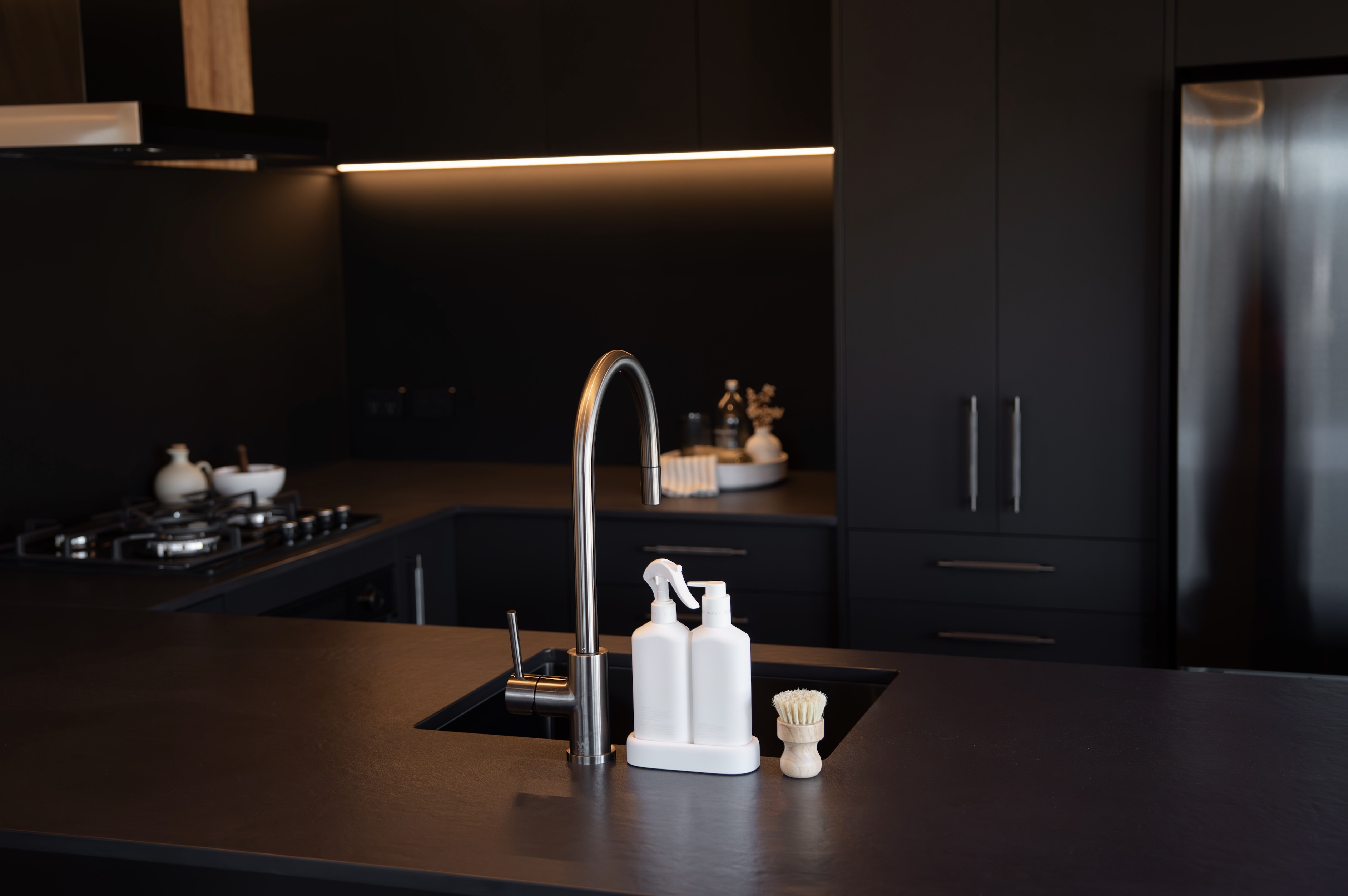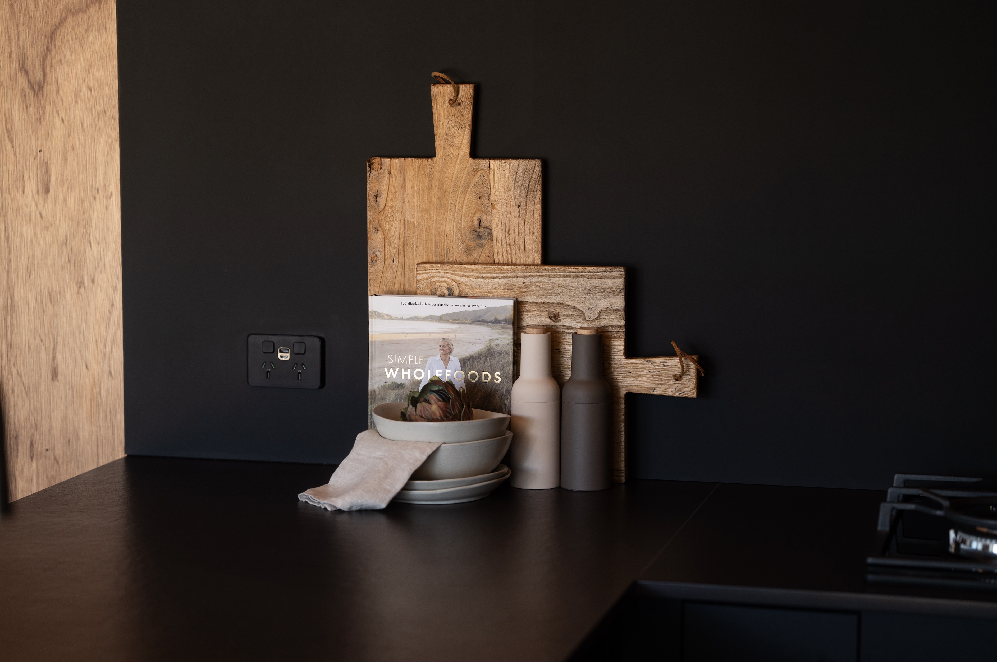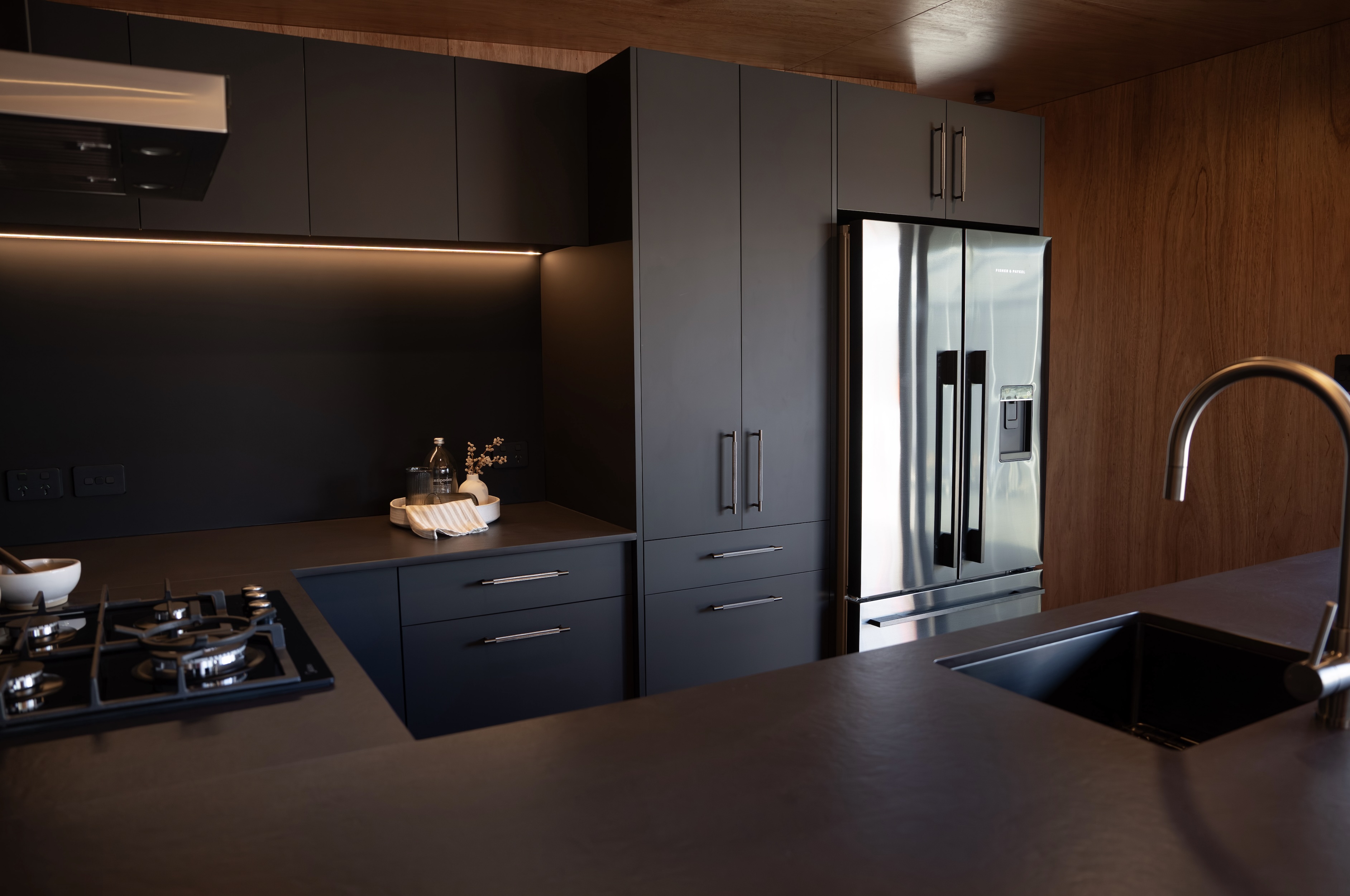 Every detail counts. The Euro tray exterior has flawless concealed fixings for a crisp, modern finish. Inside, oiled ply linings are precision-joined with black trims, matte black cabinetry is perfectly aligned with soft-close hardware, and the Dekton benchtop is seamlessly cut and fitted. Black LED downlights, matching switches, and carefully installed fixtures complete the high-end consistency.