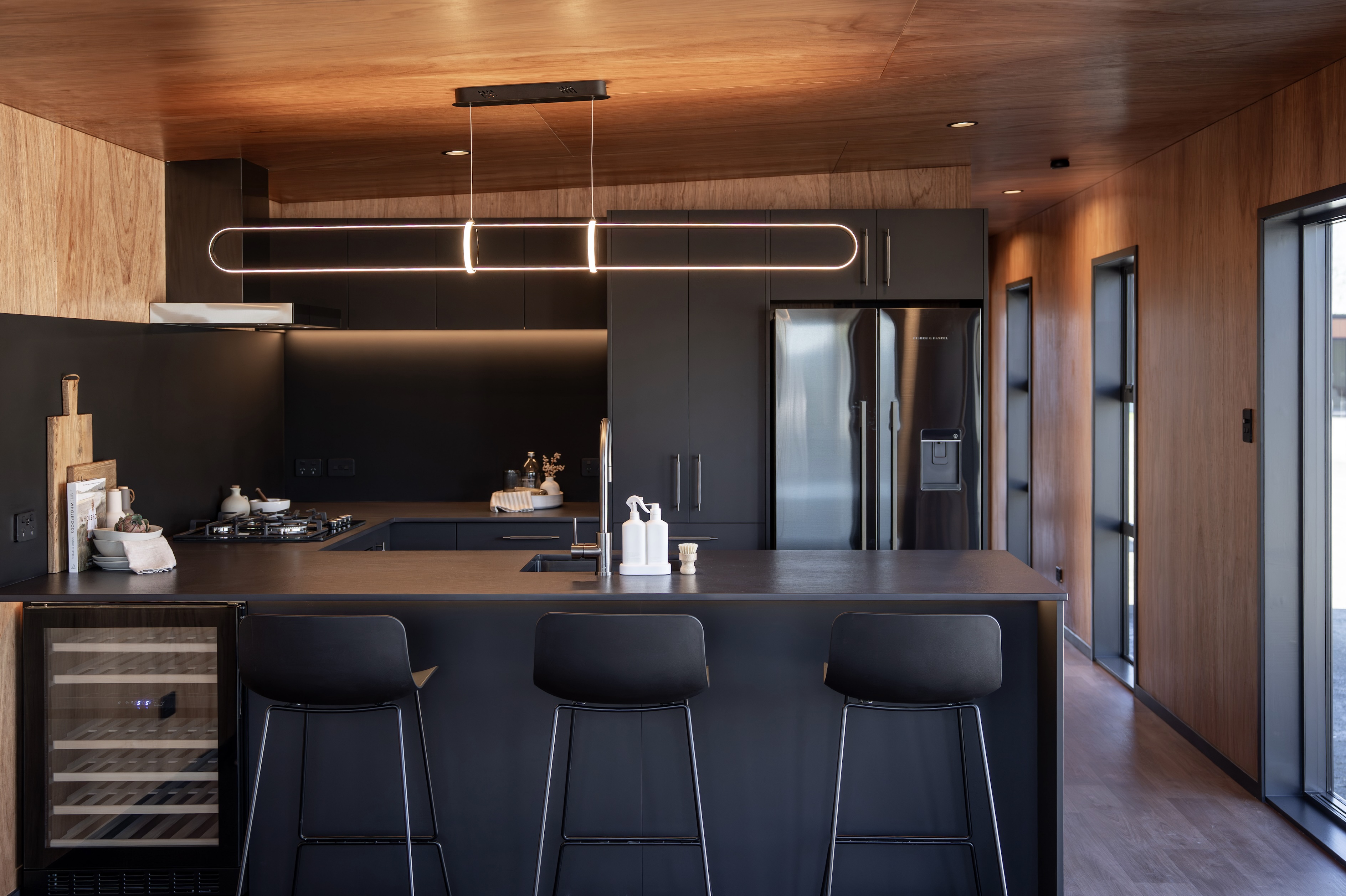 A bold yet warm aesthetic. Natural oiled ply meets deep matte black cabinetry for a striking contrast, while the Euro tray cladding adds architectural polish. Inside, statement lighting, integrated wine fridge, and gunmetal tapware deliver a designer finish. Every element—black trims, custom joinery, and premium surfaces—works together for a cohesive, wow-factor interior.